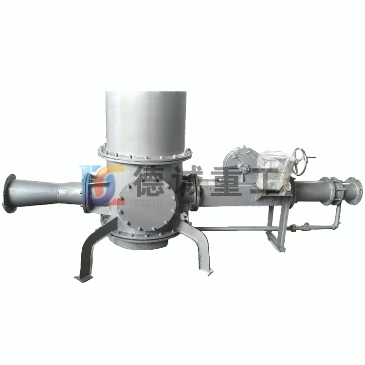 氣動(dòng)送粉機(jī)主 要包括減速傳動(dòng)裝置、料筒、噴射管、噴嘴、擴(kuò)壓管和流化室。首先噴射管將空氣或空氣與物料混合體導(dǎo)入空氣噴嘴。噴嘴將空氣的壓力能轉(zhuǎn)化為空氣的動(dòng)能,利用 空氣流的引射作用在噴嘴的出口附近造成局部負(fù)壓,將物料吸入輸送管道,并在擴(kuò)壓管中將空氣動(dòng)能轉(zhuǎn)化為壓力。齒輪減速傳動(dòng)裝置對(duì)噴嘴位置進(jìn)行調(diào)節(jié),以此來調(diào) 節(jié)物料的輸送量。料筒底部的流化室對(duì)料筒的物料進(jìn)行局部流化利于物料的輸送。送粉機(jī)工作輸送物料能量除來自于空氣動(dòng)能外,物料高度也是重要的影響因素,料 位高、則勢(shì)能大,輸送量相應(yīng)就大,反之則小。所以氣動(dòng)送粉機(jī)具有一定的自我調(diào)節(jié)能力。